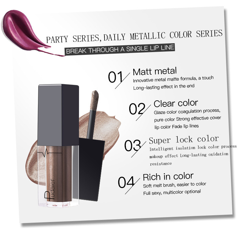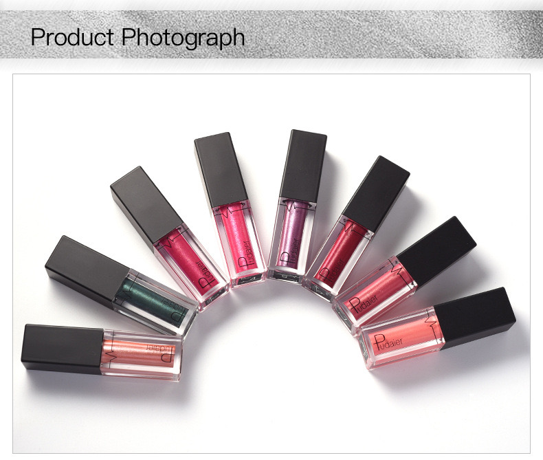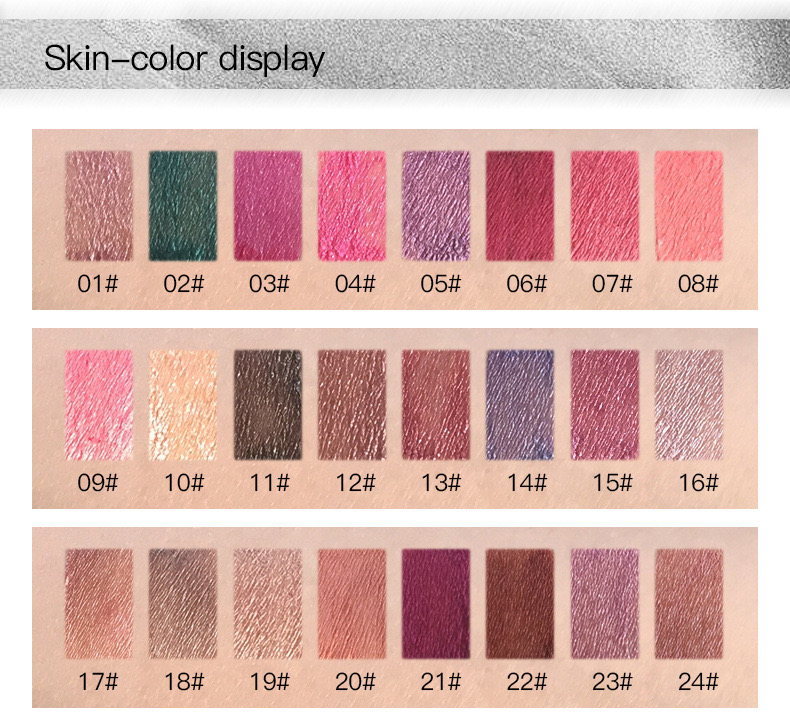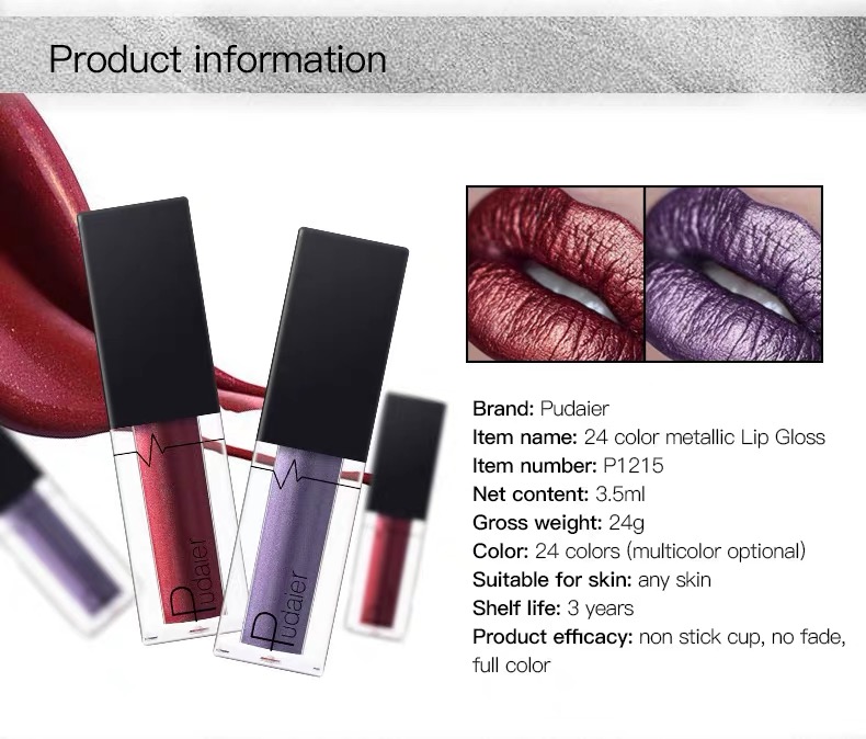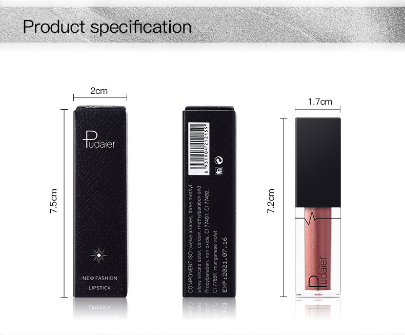 1. Net Weight: 3.5g 2. Color: 24 colors 3. Please Note: that due to lighting effect and computer color, the actual colors may be slightly different from the picture 4. Applicable User:All people 5. Product efficacy: touch the cup does not fade,It have full colors Package contents:1 Pcs Lip gloss Tips: 1.Metallic Velvet Kind. 2.Waterproof, and would Not stick on Cup. 3.better to use the lip balm or based lip items before putting it on your lip. 4. It will have good effect if you apply a very thin layer. 5.This lipgloss is very dry, please don't clip your lips before it dry, or it will be sticky. 6.It will looks a little darker if you use lip brush than your hands. so Lip brush is strongly recommended. 7.Oil food would make it fade a little,so you might need to avoid french fries when wearing this lip gloss. 8.Please apply the transparent or similar color powder on your lip if you feel it is sticky. 9.Please use professional makeup remover oil to clean them off from lips.