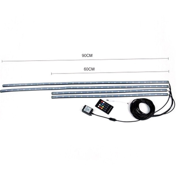 Feature: Brand new and high quality Multi colors, 15 color flashing modes Equipped with sound sensors that lets the LED lights synchronized with music beat Can adjust flashing to fit the strength of the sound Can be bent, fold, wound and fixed in place easily Perfect for under wheel arches, around the front grille, under foot-wells, in the trunk, along the dash, etc Very bright and low power consumption Sound Active Effects Several remote control patterns Specification: Voltage: DC12V Light Source: 5050 LED super bright Flexible and Waterproof: Yes Length of tube: 2x 90cm (36")+2x 60cm (24") Light Color: RGB Multi-Colors Package Included: 2x 24 inches (60cm) waterproof LED tubes 2x 36 inches (90cm) waterproof LED tubes Wireless RF Control Box Module Wireless Remote Control NO Retail Box. Packed Safely in Bubble Bag.