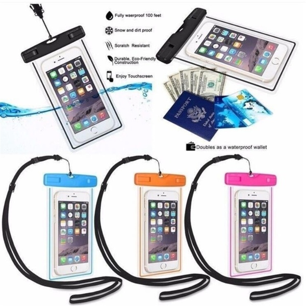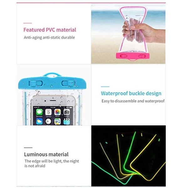 1. Double waterproof safe system for ensuring the waterproof function 2.Special transparent environment-friendly material without influencing the photographic effect 3.Soft jacket without influencing the operation of various function of the camera and with certain damage and falling preventing functions Type:Luminous mobile phone waterproof bag Material:PVC Feature:Luminous,Waterproof Color:Yellow,Blue,Green,White,Black,Purple,Orange,Rose red Size:19*10.5 cm Applicable: all phone Package:1pc