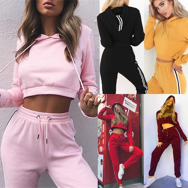 Womens Fashion Spring Sport Long Sleeve Casual Suit Lady Fashion Hooded Sweatshirt and Striped Long Pants Two Pieces Set Sportwear